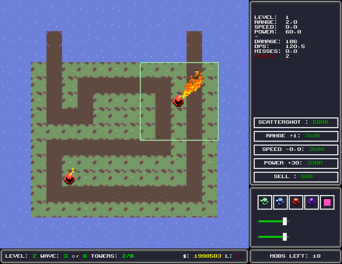 A small late-night tower defense I started coding on my son’s PC while I was between jobs. A homebrew software renderer in Java, levels drawn as 16×16 pixel bitmaps, multiple spawn points and little islands for your towers.